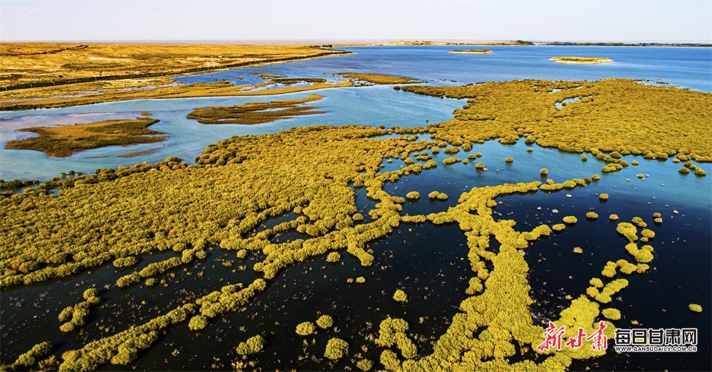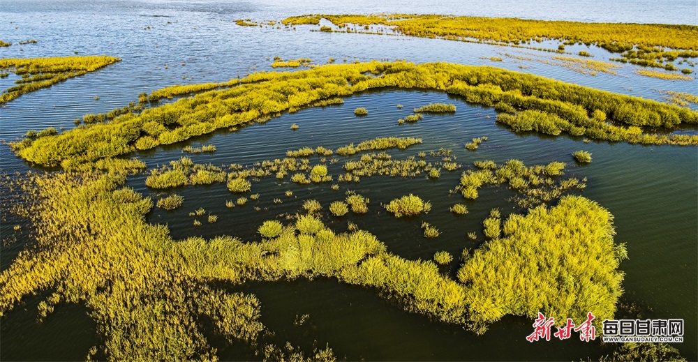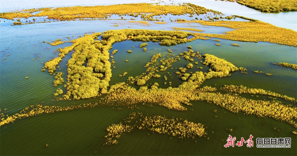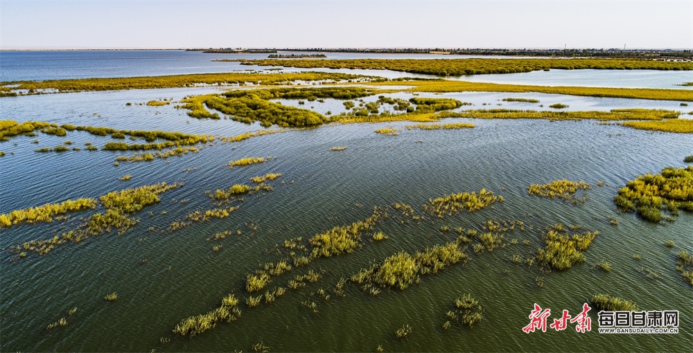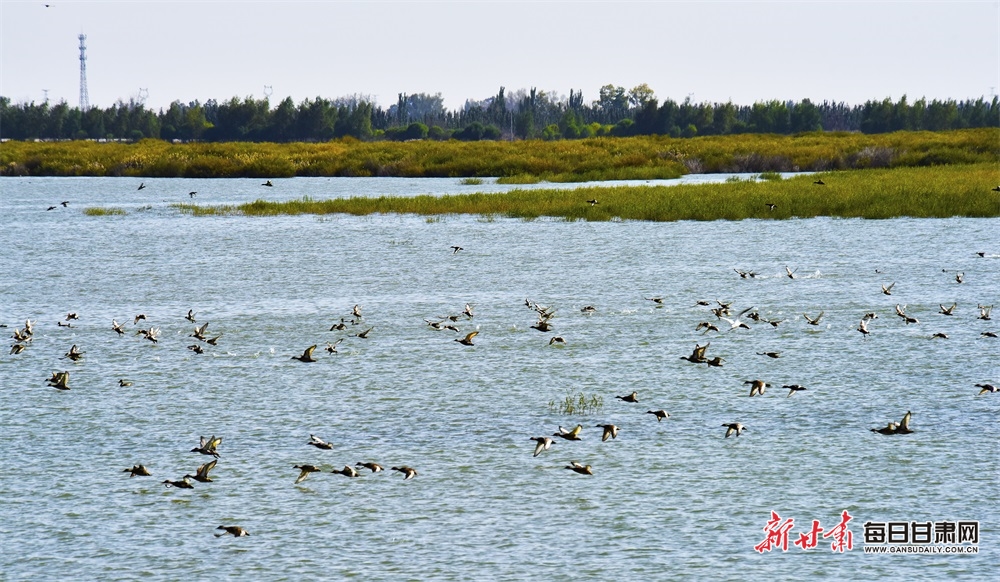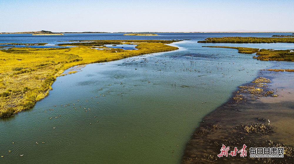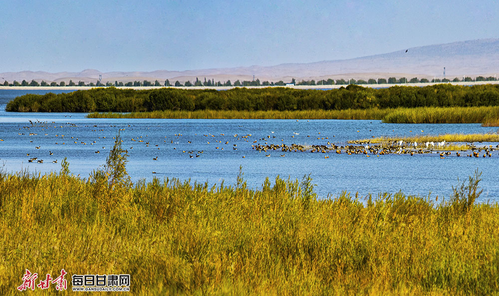金秋十月,民勤县红崖山水库碧波万顷,水天一色,库内游鱼簇簇,野鸭戏水,水鸟穿梭,构成一幅美丽壮阔的大漠生态画卷。