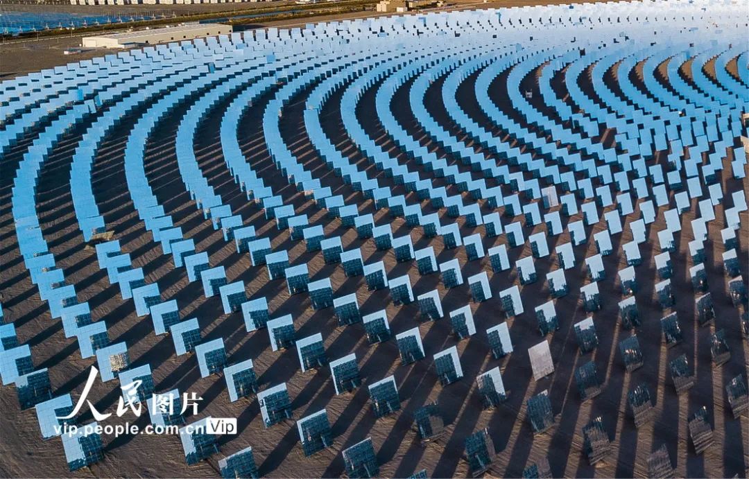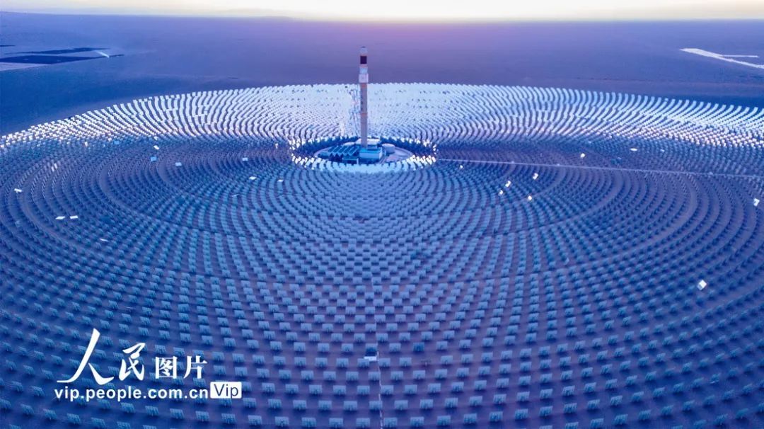 2022年10月16日,甘肃敦煌光电产业园内,万余面定日镜以同心圆状围绕着260米高的吸热塔。这些定日镜在茫茫戈壁上“逐日”,让“光”变成“电”,输送至千家万户。、