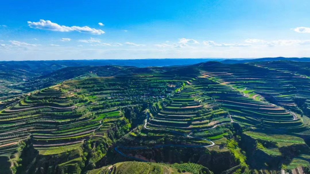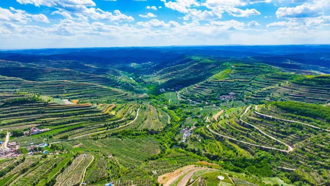 被誉为“梯田王国”的庄浪,望山山翠,看地地平。层层梯田如雕如塑,如诗如画,青山环绕,梯田纵横交错,线条优美,风光旖旎。