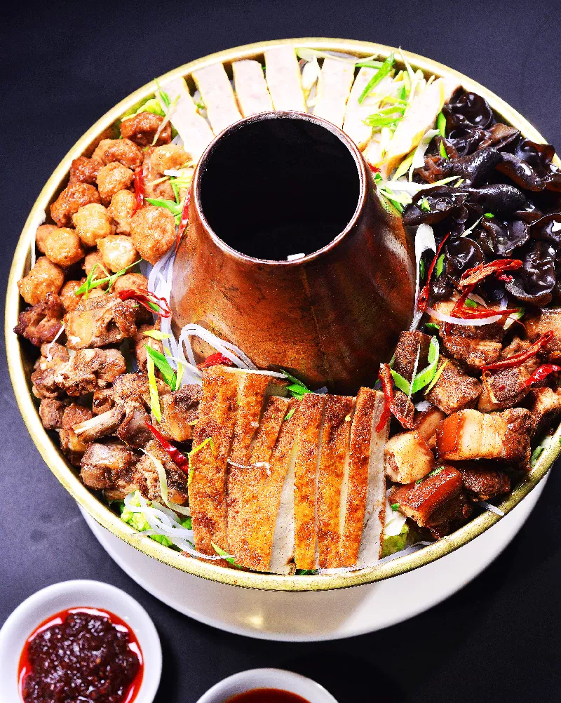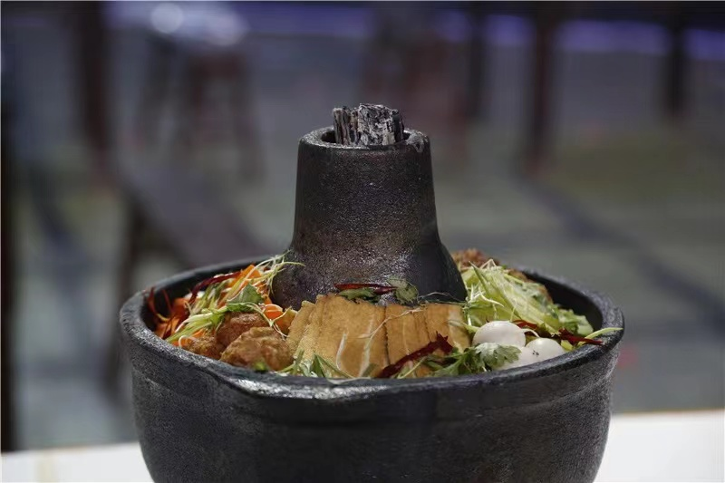 中间由空心火筒放置木炭烧煮外圈菜肴