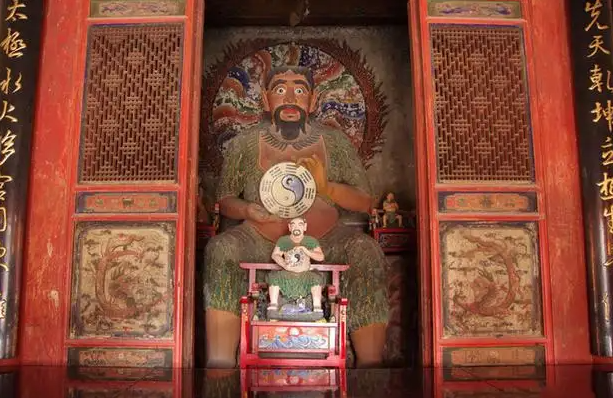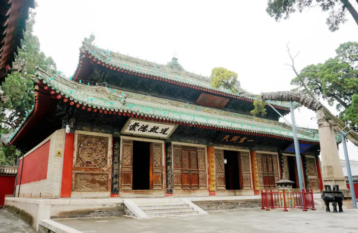 要说伏羲庙最具有特色的建筑便是先天殿了。先天殿又称正殿、大殿,是全国最大的伏羲祭祀单体殿宇。先天殿雄踞于宽阔的露台之上,整体建筑呈重檐歇山顶式,殿宇顶部以龙吻脊、雕花天宫宝刹做雕饰,顶棚以井口天花镶嵌伏羲六十四卦卦象图做装饰,正中间以藻井绘制河图和伏羲先天八卦图,高贵典雅,气度非凡,别具特色。殿内伏羲圣像高3米有余,手托八卦,目光如炬,正襟危坐神龛中,灵气逼人。殿宇虽前后经历九次重修,但风貌依旧不减当年。
