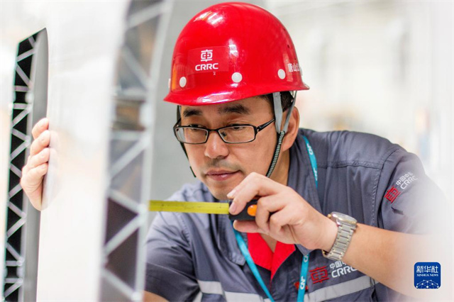 中国中车唐山机车车辆有限公司车体事业部高级技师张雪松在车体总成工序检查尺寸(2016年7月摄,资料照片)。新华社发(王卫平 摄)