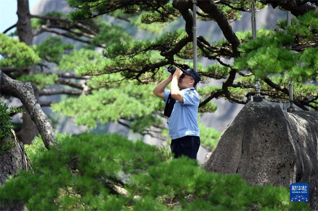 安徽黄山守松人胡晓春在例行巡查中用望远镜查看迎客松情况(2022年8月14日摄)。新华社记者 周牧 摄
