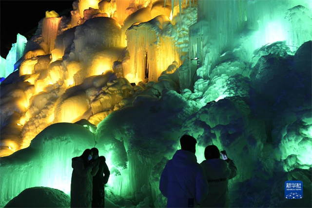 12月25日晚,游客在甘肃省大墩峡景区观赏冰瀑。新华社发(史有东 摄)