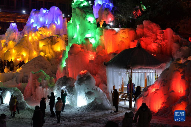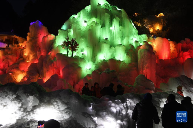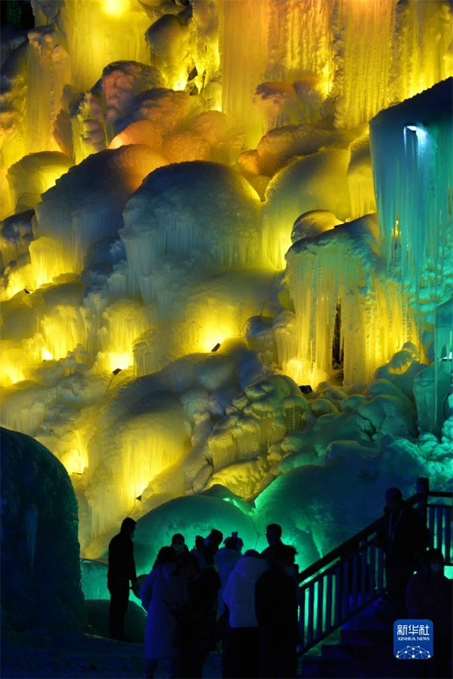 元旦将至,甘肃省临夏州积石山保安族东乡族撒拉族自治县大墩峡景区内的冰瀑、冰挂等景观流光溢彩,梦幻的冰雪世界吸引了八方宾客前来赏景游玩。