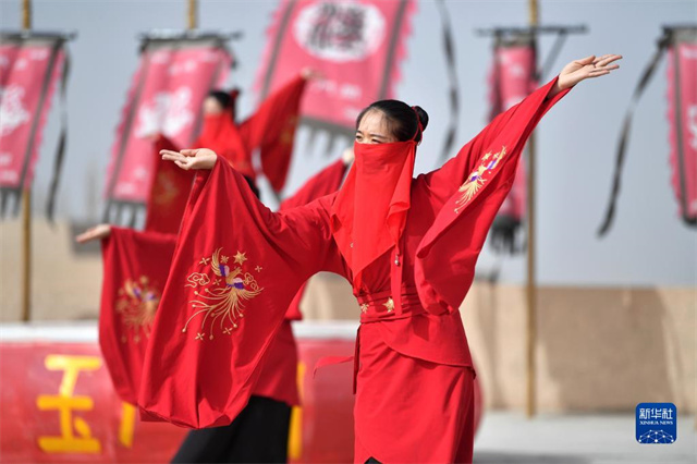 演员在玉门关景区为游客表演(3月17日摄)。新华社记者 陈斌 摄