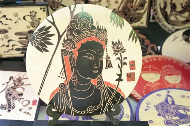 敦煌木雕画以刻刀在用砂纸打磨且已经上色、绘图的质地细腻、不易变形开裂、平整的木材上进行雕刻,具有独特的地域特色,是敦煌艺术在民间的延续,也是民间文化的重要载体。