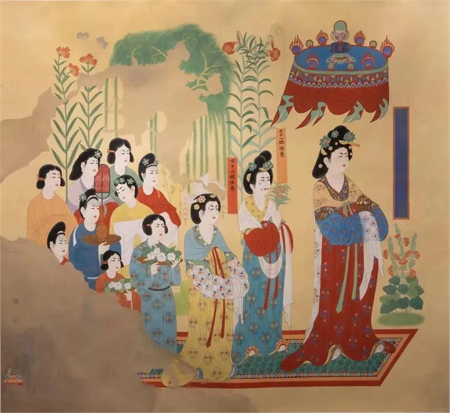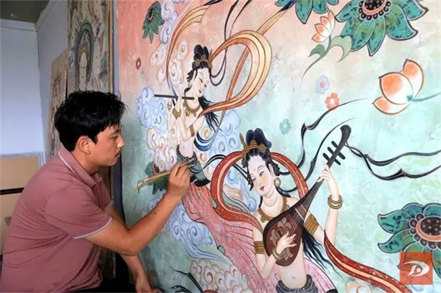 艺术工作者张杰龙运用敦煌石粉彩绘技艺临摹敦煌壁画