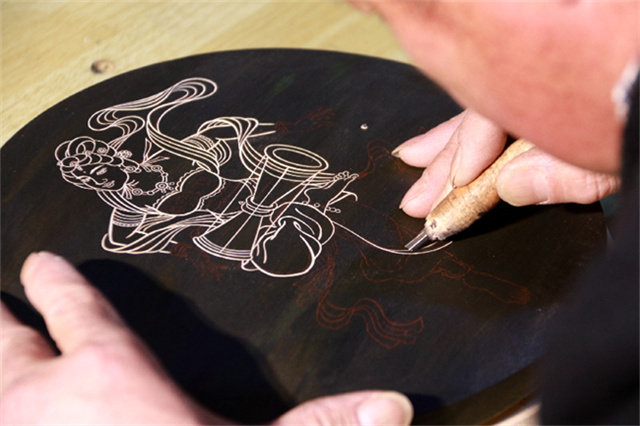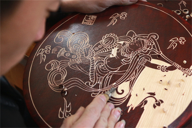 非遗代表性传承人申洪杰在敦煌市沙州市场工作室内雕刻敦煌木雕画作品《伎乐飞天》。