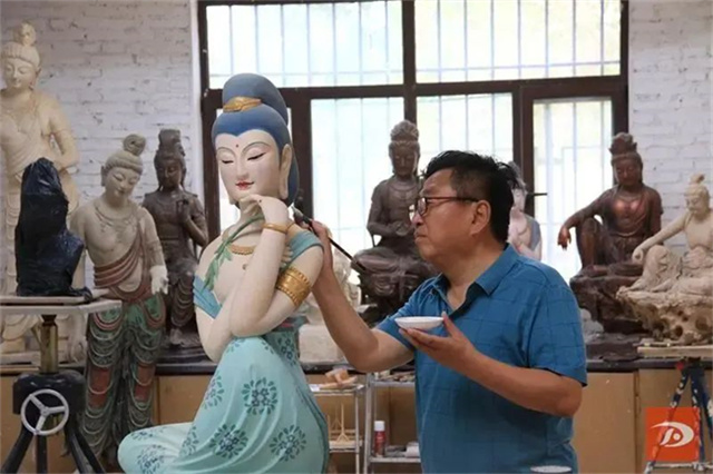 敦煌彩塑制作技艺非遗传承人杜永卫给泥塑上色