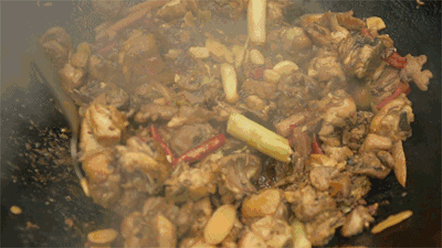 选用古浪溜达鸡,不同于鸡场饲养的速成肉鸡,散养的那些鸡肉质细嫩,味道鲜美。制作时将整鸡剁块,猛火油沸时入锅,佐以花椒、胡椒、鲜姜、精盐,出锅前加入青椒、葱丝煸炒便可。未入盘便香气四溢,食之味道醇美悠长,香味鲜有可比者。