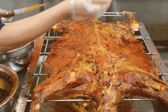选天祝草原上长大的羊小腿,用锋利的刀尖平行地横切出一个个开口,放进密封的容器内,加入适量花椒、姜、盐三种调料腌透入味,刷上一层本地产的菜籽油,将黑胡椒、孜然、辣椒粉等调料撒在腌好的羊小腿上,用锡纸包好,入烤箱慢热烤制,约十几分钟,脆黄酥嫩的羊脚巴,款款上桌,香气氤氲。