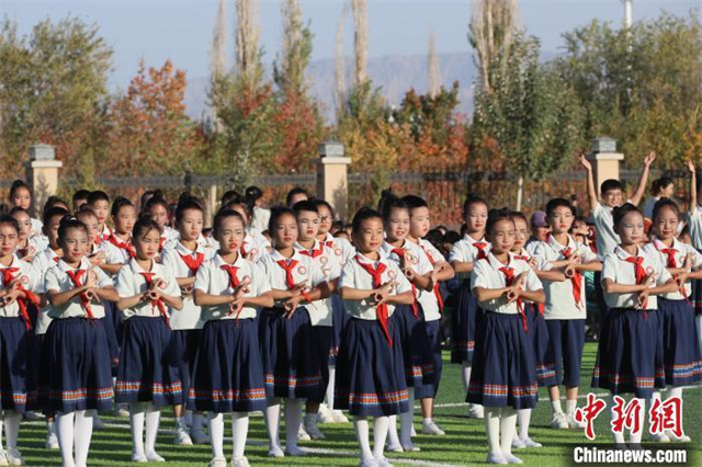 10月13日,在敦煌文化进校园暨敦煌文化校服展示活动上,当地学生展示“敦煌文化校服”。