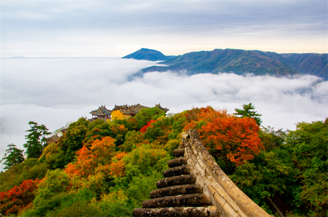 时至深秋,崆峒山秋景已上线,清晨的雾气掩护在古色古香的建筑之上,金黄与棕红交叠,宛若误入人间秘境。