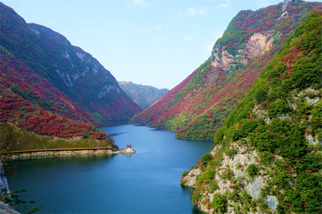 初冬时节,陇南成县磨坝峡美得像一幅五彩斑斓的水彩画,水库两岸漫山遍野的黄栌、枫叶、黄连木等树叶在秋风的吹拂下逐渐变红,与山间翠绿的松柏红绿相间,格外美丽。山上美丽的景色倒映在清澈的湖水中,水中有山,水天一色,红叶绿树交相辉映,望远山层林尽染,美不胜收。