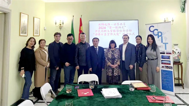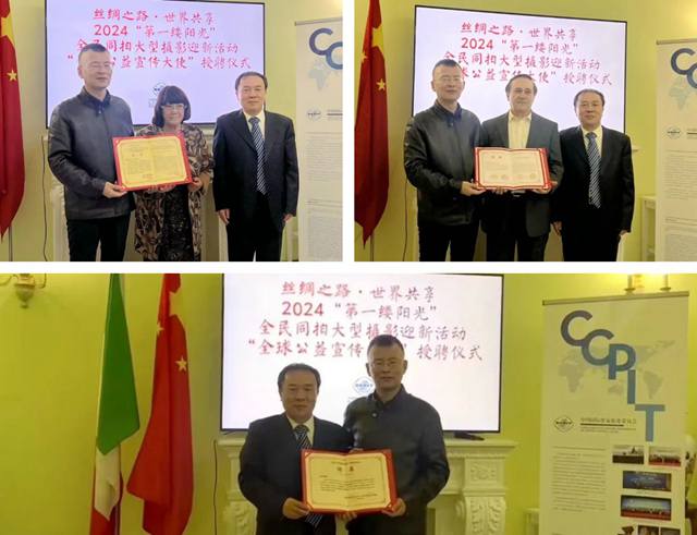 中国访问学者秦兵教授,代表中国西北旅游协作区向意大利中国丝绸之路文化交流合作中心主席、著名汉学家梅毕娜教授、意大利茶业与花草茶协会(ITA·TEA)主席Marco Bertona先生颁发了2024“第一缕阳光”全民同拍大型摄影迎新活动“全球公益宣传大使”聘书;姚良军向秦兵颁发了聘书,意大利著名电视制片人和探险家Beppe Tenti先生因故未能出席,特委托梅毕娜教授接受聘书。
