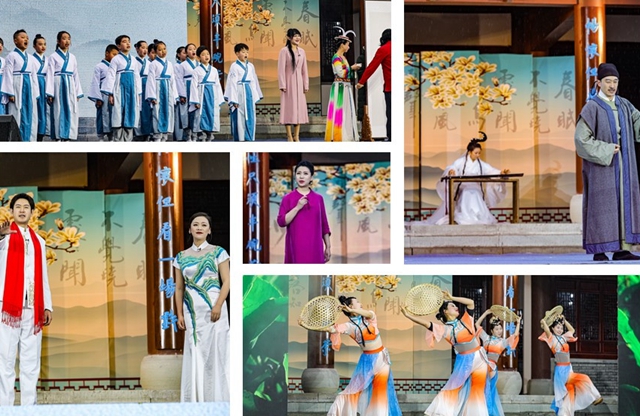 “孟春之月,群居者将散,行人振木铎徇于路,以采诗”,在舞台上采诗官的讲述中,观众开启了一场水墨画卷中的诗书乐舞旅程。学堂内,学童们吟诵起脍炙人口的《春晓》,老师正在讲授朱自清的《春》,古今文学经典恰如其分地诠释着观众眼前这美丽的初春景象。身着汉唐服装的女子在白水江碧波、油菜花田的舞台呈现中翩翩起舞,古风舞蹈《春江水暖》向观众展示出古代人们迎接春天的喜悦场景。紧接着,独立音乐人李建傧登场,配合着古朴的吉他吟唱《诗经·秦风·蒹葭》,3000多年前,秦陇大地文脉赓续灼灼光华的盛景跃然观众眼前。现代诗朗诵《春天的谦词》《碧口》,描摹出诗人亮子和包苞心目中的陇南春日景象,歌曲《心驻碧口》更是将人们对碧口古镇的热爱化作美妙的旋律在这片青山绿水间回荡。