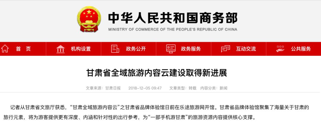 近日,“甘肃省全域旅游内容云建设取得新进展”一文受到中国人民共和国商务部关注并将全文刊发于其官方网站。