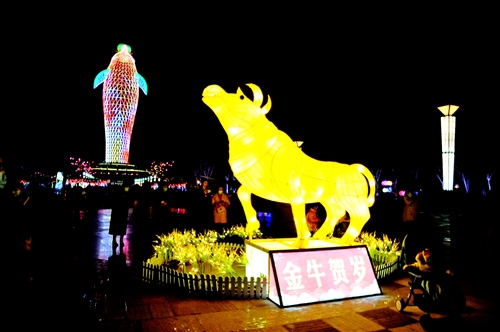 “金牛贺岁”花灯与西部明珠气象塔遥相呼应