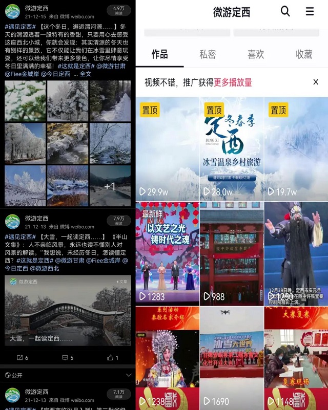 注重多措并举,加大宣传推介。一是注重活动营销。通过举办定西市冬春季冰雪温泉旅游启幕活动、定西市庆元旦大型戏曲晚会等,引导各县区分别组织开展了冰雪旅游启动仪式及系列活动,以活动吸引游客,引爆假日文化旅游市场。二是紧盯兰州主客源城市。通过高铁站大屏展播定西冬春季冰雪旅游宣传片,举行冰雪旅游新闻发布会,推介会现场邀请当地网红达人在线直播等方式,高频次宣传推介定西冰雪温泉及美食特产资源。三是紧盯媒体宣传。节前拍摄制作定西冰雪旅游宣传视频,编发微信图文宣传信息50多期,通过国家及省市主流媒体及微信公众号、腾讯视频、爱奇艺、今日头条、网易、新浪微博、抖音、快手等新媒体平台转发宣传1000多次,全网宣传播放量超过3000万次。