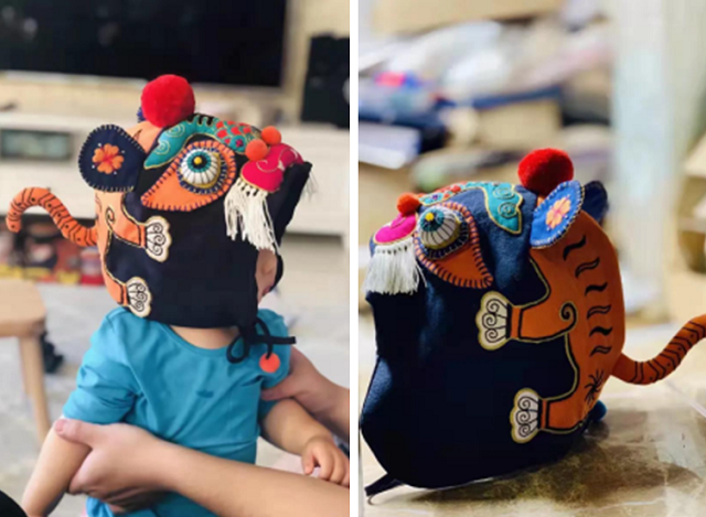 老百姓或因此效仿,为婴童亲手制作佩戴虎头帽,以借虎之神威,佑孩子健康成长,不受邪祟侵扰。此习俗随漫长的时间洗礼,几乎遍及中国各地。帽子为一身之冠首,因此虎头帽格外被长辈重视,造型丰富、色彩多变,艺术性与实用性兼备,成为中国民间艺术中的典范。