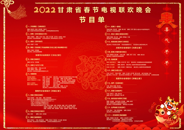 1月23日至26日,由省文化和旅游厅、省广播电视总台联合主办,甘肃文化影视频道承办的2022年甘肃省电视春节联欢晚会在省广电总台演播大厅完成录制,将于1月30日20点,在甘肃卫视、甘肃文化影视频道快手账号、视听甘肃APP、丝路明珠网、甘肃IPTV同步播出。