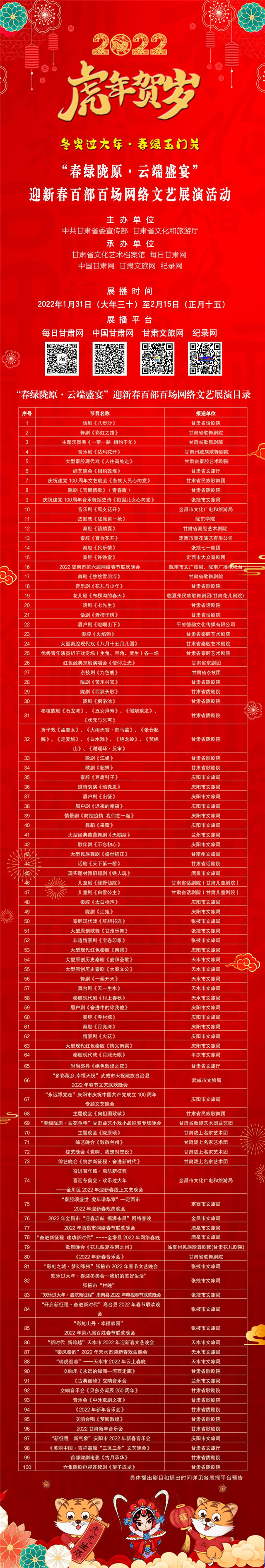 一元复始陇原美,春绿陇原文艺兴。新春佳节到来之际,甘肃省文化和旅游厅精心策划,组织全省文旅部门、各文艺院团和文艺工作者,为广大群众精心准备了空前的“云端文艺盛宴”。由中共甘肃省委宣传部、甘肃省文化和旅游厅主办,甘肃省文化艺术档案馆、每日甘肃网、中国甘肃网、甘肃文旅网、纪录网联合承办的“冬奥过大年 春绿玉门关”百日千场文化暨2022年“春绿陇原·云端盛宴”迎新春百部百场网络文艺展播活动,将于2022年1月31日拉开帷幕,100部(台)精彩纷呈的优秀剧目和文艺演出,将为广大群众在春节期间带来一份前所未有的文艺盛宴。