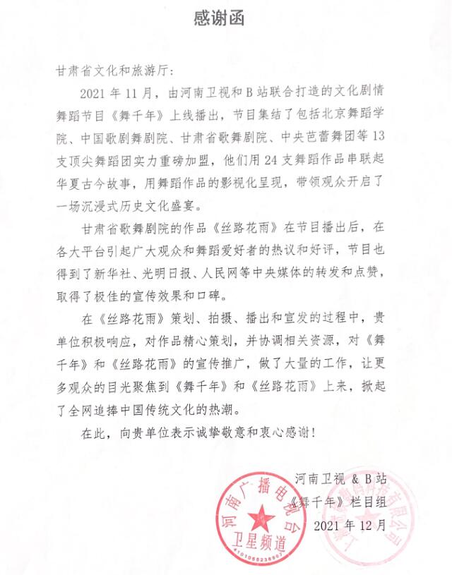 感谢信写到:2021年11月,由河南卫视和哔哩哔哩网站(B站)联合打造的文化剧情舞蹈节目《舞千年》上线播出,节目集结了包括北京舞蹈学院、中国歌剧舞剧院、甘肃省歌舞剧院、中央芭蕾舞团等13支顶尖舞蹈团实力重磅加盟。他们用24支舞蹈作品串联起华夏古今故事,用舞蹈作品的影视化呈现,带领观众开启了一场沉浸式的历史文化盛宴。甘肃省歌舞剧院的作品《丝路花雨》在节目播出后,在各大平台引起广大观众和舞蹈爱好者的热议和好评,节目也得到了新华社、光明日报、人民网等中央媒体的转发和点赞,取得了极佳的宣传效果和口碑。在《丝路花雨》策划、拍摄、播出和宣发的过程中,甘肃省文化和旅游厅积极响应,对作品精心策划,并协调相关资源,对《舞千年》和《丝路花雨》的宣传推广做了大量的工作,让更多观众的目光聚焦到《舞千年》和《丝路花雨》上来,掀起了全网追捧中国传统文化的热潮。
