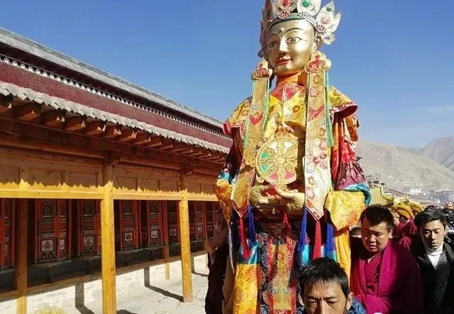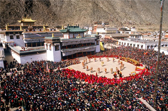 正月祈愿法会,藏语称为“毛兰姆”。自正月初一晚起,到正月十六日止。其间各寺院的全体僧人,每天要在大经堂诵经6次,其中第4次专为祈祷,祈祷佛法常在,有情安乐,天下太平等。正月初八日举行“放生”,给准备好的马、牛、羊洒上净水,在耳朵上系上彩带等后放走,凡是被放生的马、牛、羊,不允许任何人猎取。正月十三日举行“瞻佛”,将数十丈长的绣制佛像,展挂在晒佛台,僧众高诵沐浴经,群众肃然,场面盛大。十四日举行跳法舞会。十五日晚间举行酥油花供灯会,僧人制作的酥油花,陈列于大经堂周围,并供上酥油灯,使酥油花更显得鲜艳夺目。展出后互相评比竞赛,排列名次。十六日“转弥勒”,僧众抬着弥勒佛,在乐队伴奏下,绕寺一周,以示未来佛弥勒将要治世。