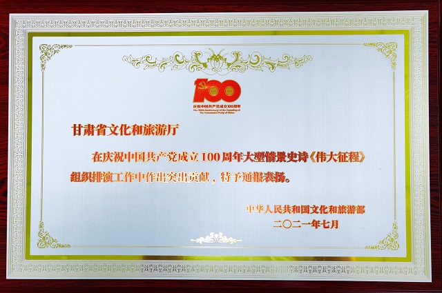 2021年6月28日晚,在党的百年华诞之际,庆祝中国共产党成立100周年文艺演出——大型情景史诗《伟大征程》在国家体育场盛大举行。演出共分为四个篇章,综合运用多种艺术手段,生动展现中国共产党百年来带领中国人民进行革命、建设、改革的壮美画卷,热情讴歌党的十八大以来,在以习近平同志为核心的党中央坚强领导下,中国特色社会主义进入新时代,昂首阔步迈向全面建设社会主义现代化国家的新征程。整场演出以史诗的美学品格以及巨大的艺术感染力,展现了中国共产党百年奋斗的光辉历程,反响热烈,好评如潮。2021年7月,文化和旅游部对甘肃省文化和旅游厅、山东省文化和旅游厅等单位进行通报表扬,并颁发了奖牌。