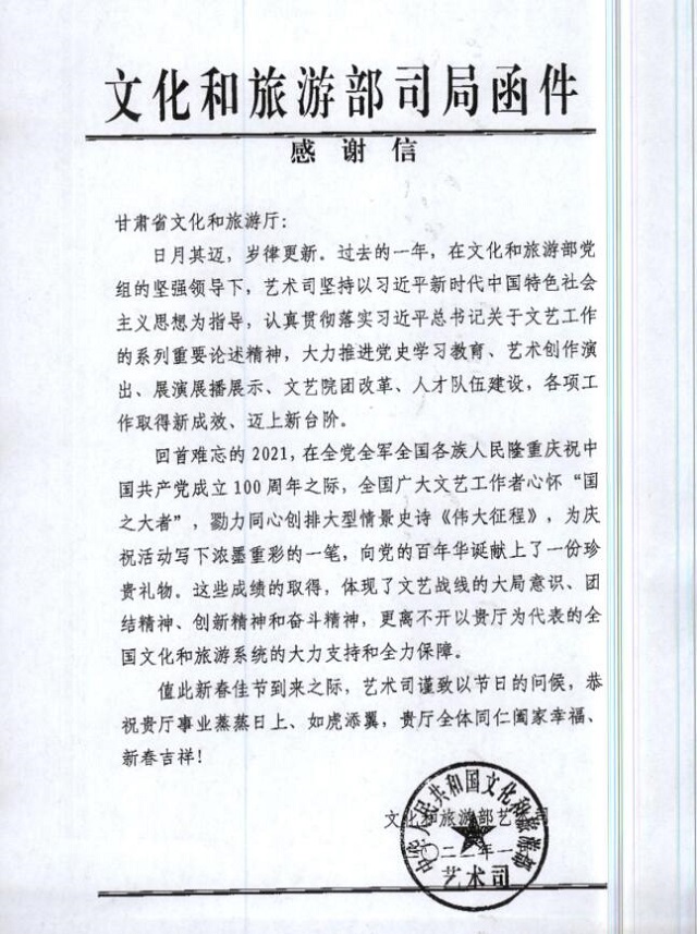 《伟大征程》排演做出突出贡献 文化和旅游部艺术司向甘肃省文旅厅发来感谢信
