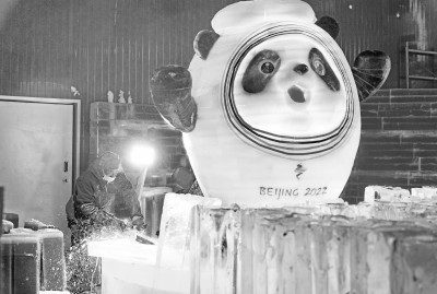 虎年春节前,在甘肃省陇南市成县成州冰雕艺术馆内,冰雕艺人正在加班加点精雕北京冬奥会吉祥物“冰墩墩”。陈争强摄/光明图片