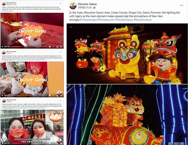 甘肃文旅Facebook海外账号在春节前后进行了2022年“欢乐春节”甘肃文化旅游资源的专题宣传和推广,以视频现场拍摄和演播室拍摄结合的形式,制作六期视频向海外介绍了甘肃腊八节习俗、过年准备的年货、腊月二十三习俗、除夕过年传统、大年初五传统、元宵节等春节传统习俗,主持人以全英文出镜,多渠道、多形式、多角度展示甘肃民俗和非遗活动,体现中国春节的文化性、艺术性、传统性与国际性。