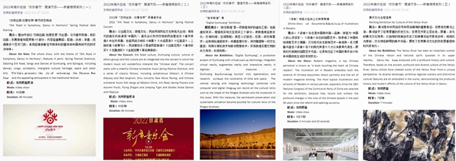 中国驻哥伦比亚、阿尔及利亚、肯尼亚大使馆,中国驻悉尼总领馆,悉尼、老挝、吉隆坡、尼泊尔等中国文化中心举办了“交响丝路·如意甘肃”春节文艺联欢晚会,分别在当地电视台连续播出多场。哥伦比亚、保加利亚、马来西亚吉隆坡举办了2022年“交响丝路·如意甘肃”新春音乐会,用现代的音乐风格演绎“中国风”,使当地民众感受丝路文化、敦煌文化、民族民间民俗文化的独特魅力。“数字敦煌”展相继在哥伦比亚、以色列、澳大利亚、马来西亚等多国展出,运用虚拟现实、增强现实和交互现实等技术,让参观者打破时间、空间限制,足不出户感受莫高窟外形、洞内雕塑等一切文化遗迹。中国驻俄罗斯、阿尔及利亚大使馆以及阿尔及利亚、吉隆坡等中国文化中心举办了“交响丝路·如意甘肃”文化旅游形象宣传片展播,宣传片整体展示了甘肃绚丽多彩、大气恢宏的壮美景色,向观众展现了甘肃独特的文化旅游魅力。