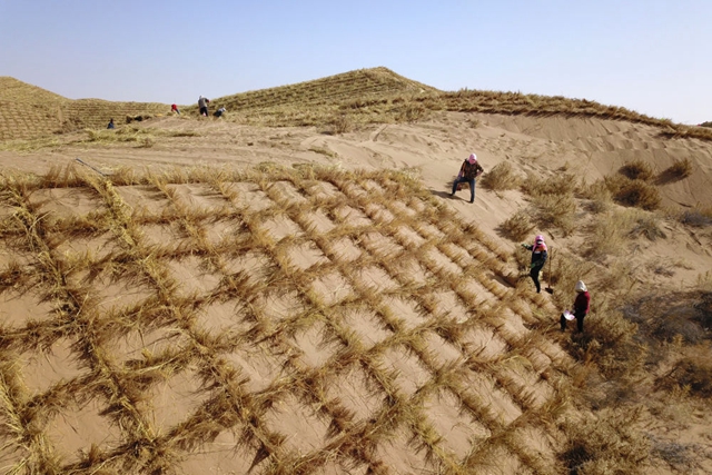 在古浪县北部沙区旱麻岗治沙点,八步沙林场治沙人和群众一起扎草方格压沙(无人机照片)。新华社记者 范培珅 摄(资料图片)
