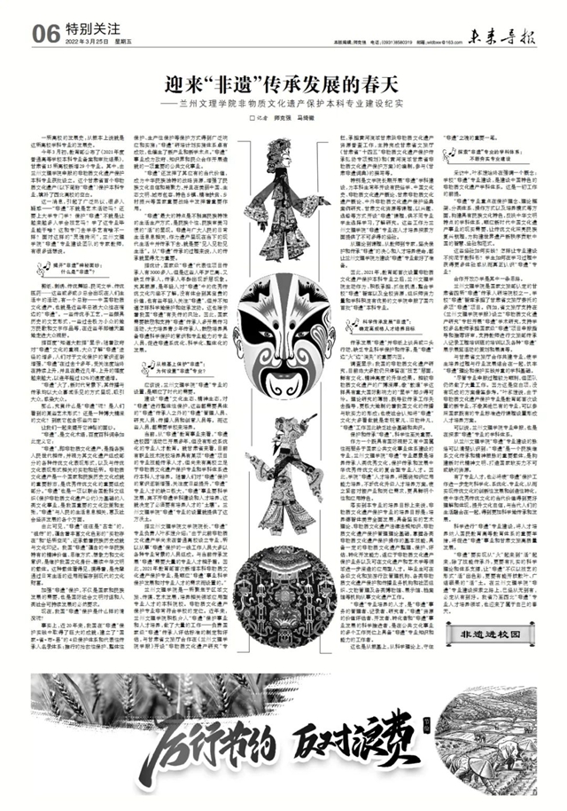 兰州文理学院是一所聚焦于区域文旅、传媒、艺术发展,培养相关领域应用型专业人才的本科院校。非物质文化遗产保护专业非常符合学校的定位。近年来,兰州文理学院积极介入“非遗”保护事业和人才培养,做了大量的工作——负责国家级“非遗”传承人评估标准的制定和评估,与甘肃省文旅厅合作在《兰州文理学院学报》开设“非物质文化遗产研究”专栏,承担黄河流域甘肃段非物质文化遗产资源普查工作,主持完成甘肃省文旅厅《甘肃省“十四五”非物质文化遗产保护传承弘扬专项规划》和《黄河流域甘肃省非物质文化遗产保护方案》的编制,参与《甘肃非遗词典》的撰写等。