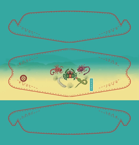 庆阳香包绣制技艺中有惟妙惟肖的五毒元素,五种毒虫或被制作成香包,在端午节期间挂在孩子们的后背上,或者绣制在肚兜上,给年幼的孩童裹住最容易受寒的肚脐。设计者从庆阳香包绣制技艺中提取了这一“抗疫”元素后,通过手绘图的方式使“五毒”元素融入口罩,并命名为“五毒不侵”非遗防疫口罩。