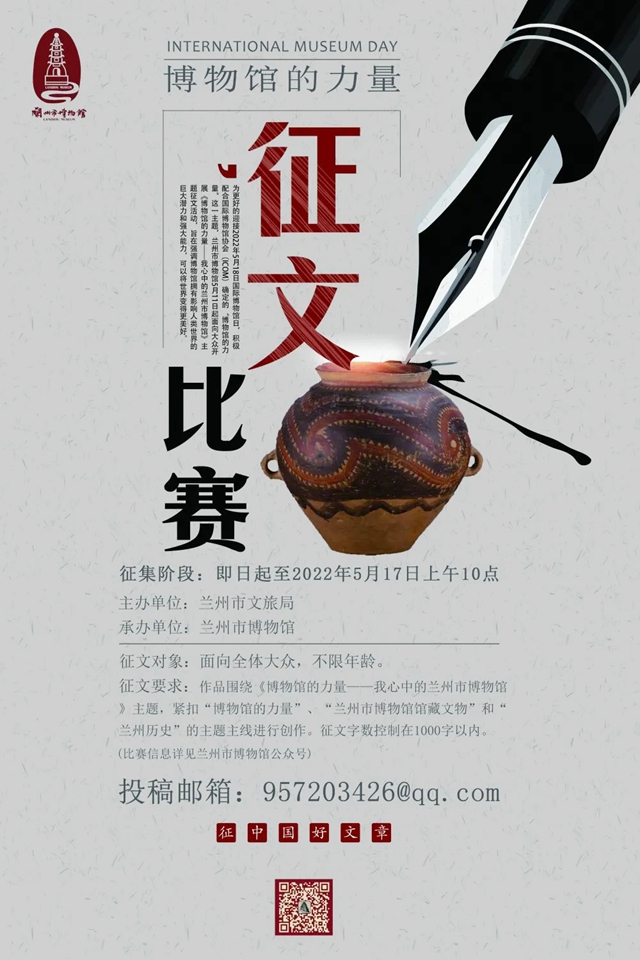 为更好的迎接2022年5月18日国际博物馆日,积极配合国际博物馆协会(ICOM)确定的“博物馆的力量”这一主题,兰州市博物馆5月11日起面向大众开展《博物馆的力量——我心中的兰州市博物馆》主题征文活动,旨在强调博物馆拥有影响人类世界的巨大潜力和强大能力,可以将世界变得更美好。