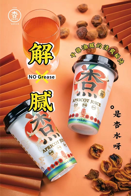 敦煌市面上销售杏皮水的店很多,购买的游客也多,透明的塑料杯,最多在封口的塑料上印上厂家,让80后回忆起学校门口卖的饮料,有一种怀旧的风潮。在全国茶饮市场如火如荼抢滩登陆之际,人们对饮品的包装审美需求开始提高。至此,敦煌杏皮水制作技艺代表性传承人刘军与外地设计师对接,打造了一款橙色为主色调的杏皮水外包装与主题海报。