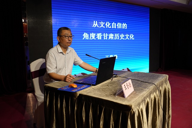 开班仪式结束后,王登渤以《从文化自信的角度谈甘肃历史文化》为题,从董仲舒、费孝通、余秋雨、弗朗西斯等古今中外学术大家的著作和论点谈起,以伏羲文化、大地湾文化、马家窑文化等甘肃历史文化为重点,介绍了文化的背景,引出了文化的概念,总结了文化的作用,系统阐述了甘肃文化的源头性、传承性等特征,讲课内容深入浅出,语言通俗易懂,让学员近距离地接受了一次文化滋养和艺术熏陶,得到广大学员一致好评。
