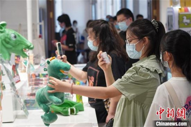 6月30日,甘肃省博物馆文创中心“铜奔马”文创毛绒玩具吸引参观者。九美旦增 摄