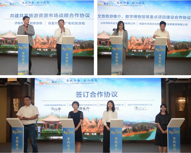 推介会上,与会领导共同启动了“花儿临夏”精品旅游线路、黄河文化研学游线路发布暨“济南万人游临夏”活动。播放了济南市和临夏州文化旅游宣传片,济南市文化和旅游局与临夏州文化广电旅游局负责人推介了文旅资源。济南市文化和旅游局与临夏州文化广电和旅游局签署了《共建共享旅游资源市场合作协议》,济临两地部分重点文旅企业签署了重点项目建设、共建共享合作协议。