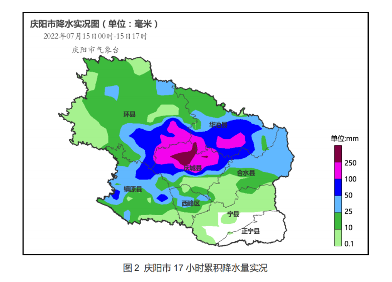 据悉,此次降水过程中庆阳市局地出现暴雨。7月15日凌晨至17时,庆阳市81个出现降水的乡镇中,特大暴雨4站,大暴雨15站,暴雨20站,大雨23站。累积降水量超过200毫米的分别为庆城县翟家河368毫米,庆城县土桥284.1毫米,华池县刘家庙278.8毫米,华池县王咀子277.1毫米和庆城县阜城231.2毫米。