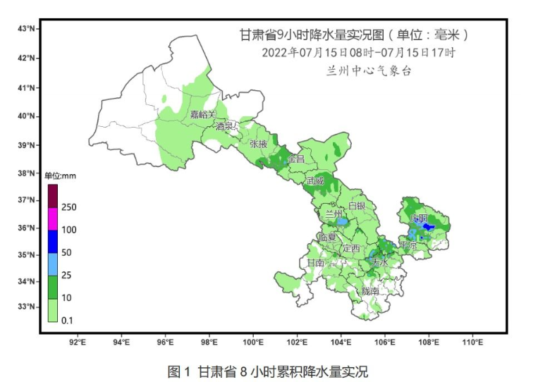 气象数据显示,7月15日8时至17时,全省共计807个乡镇出现降水,其中,暴雨15站,大雨77站,中雨241站。在全省807个出现降水的乡镇中,庆阳市81个乡镇出现降水,天水市88个乡镇出现降水,平凉市81个乡镇出现降水,兰州市49个乡镇出现降水,定西市87个乡镇出现降水,张掖市57个乡镇出现降水。