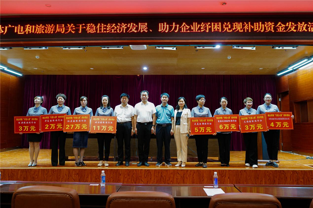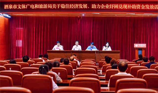 为积极应对新冠肺炎疫情影响,稳定经济社会发展,帮助文化旅游企业渡过难关,酒泉市文体广电和旅游局认真落实《酒泉市贯彻落实稳住经济一揽子政策措施行动方案》,于2022年7月27日,在敦煌市图书馆报告厅,对2021年以来符合“引客入酒”条件的敦煌市北方国际旅行社等8家旅游企业和率先复演的《又见敦煌》演艺给予资金补助,用于缓解企业经营压力,助力旅游市场复苏发展。