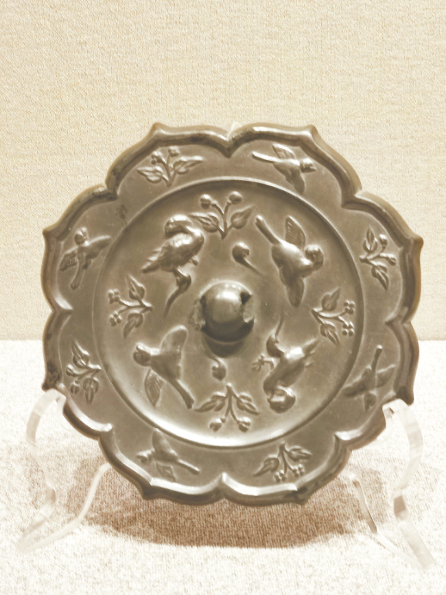 平凉市博物馆藏,唐代,八瓣菱花形,内切圆形,圆钮。上下左右交隔对称分布四只鸾鸟、四枝二叶二苞折枝花。