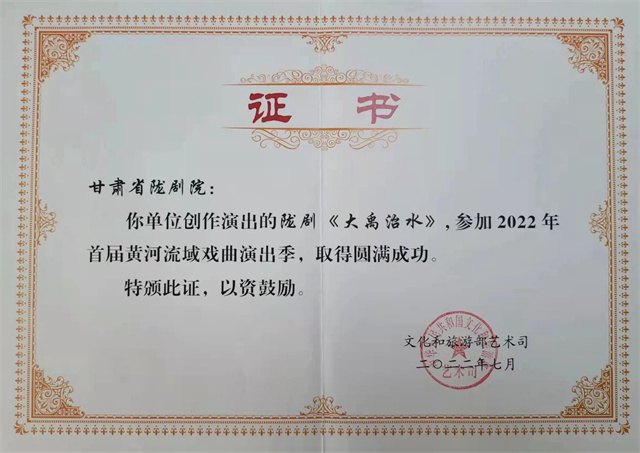 2022年首届黄河流域戏曲演出季圆满收官,陇剧《大禹治水》荣获文化和旅游部艺术司颁发的成功参演荣誉证书,并在“一剧一评”当中得到了国内专家的一致好评。至此,这部被誉为“陇剧曙光”的好剧又一次迈上了一个新的台阶。