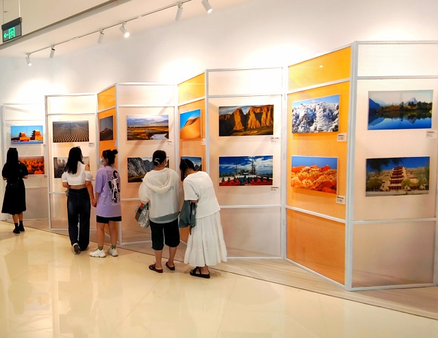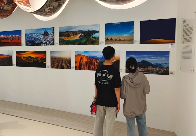 走进展区,一个个被定格的精彩瞬间,在独具设计风格的展墙和展架映衬下,跃入参观者眼帘,引得大家纷纷驻足观看。当地民众仔细观看、品味着每一幅来自大西北的壮美风韵,时尚达人们在展墙前结伴打卡留影;一对情侣的观展更是引起工作人员的注意,他们站在大漠夜空的图片前认真端详,不禁窃窃私语地说:“我们去这里旅行吧,一起去看长河落日,一起去追星辰大海!”