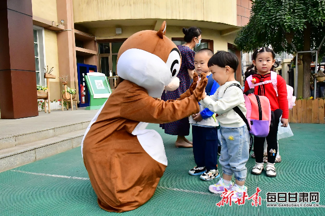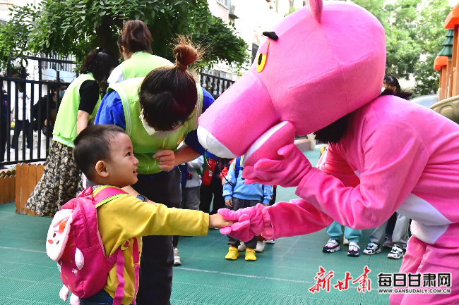 在和政路幼儿园门口,有两名老师打扮成可爱玩偶造型迎接小班小朋友们的到来。为了让第一次入园的小朋友们更快适应幼儿园生活,和政路幼儿园采用渐进式入园方式,小班小朋友们在园内时间由第一天一个小时逐渐过渡到一早上,让家长和孩子都能适应新的环境。