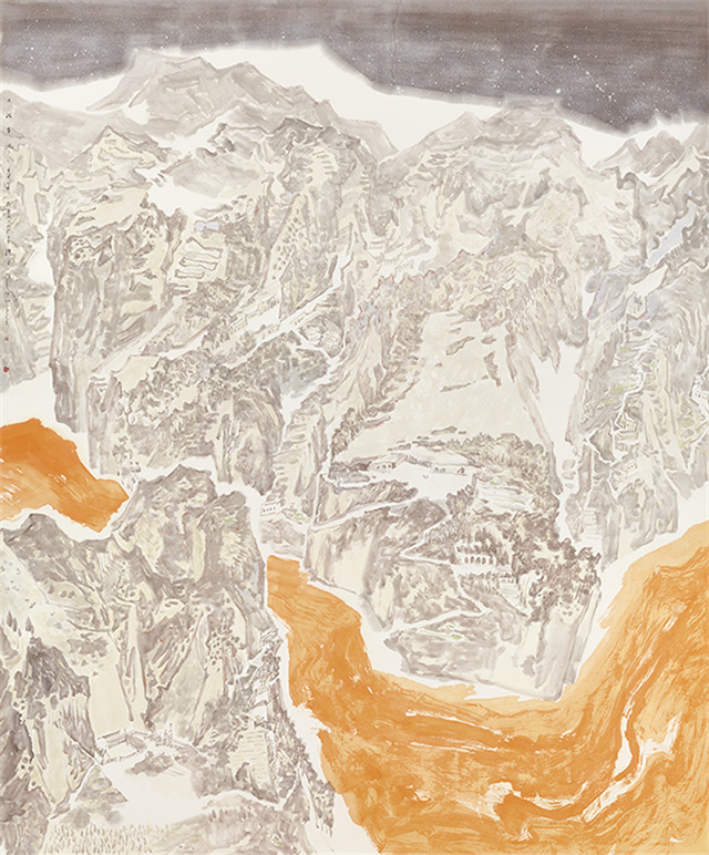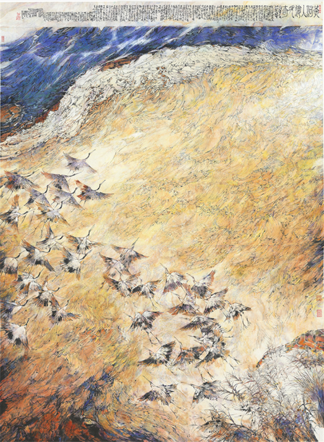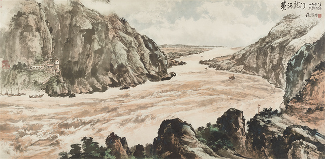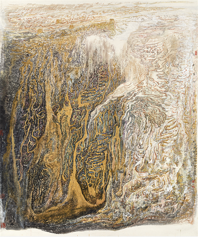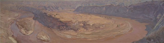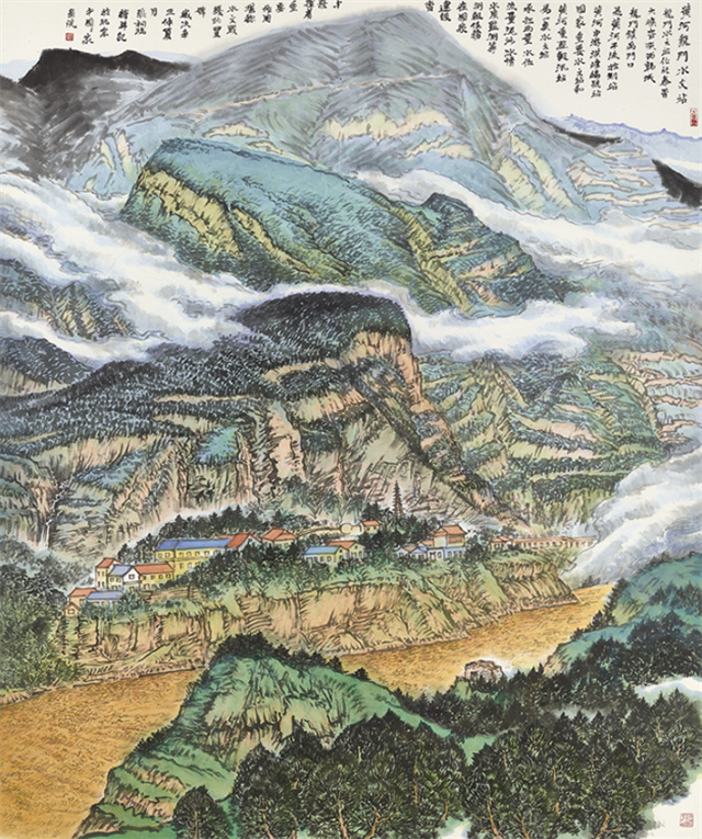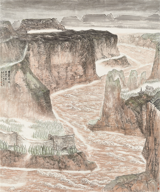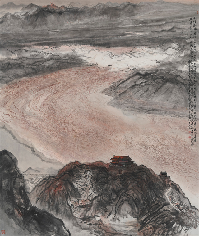 在兰州A9美术馆展厅里陈展的一幅幅作品,就像一幕幕壮丽辉煌的画卷,或演绎、或定格、或回望、或思索着黄河“浩荡贯长虹,浪涛气势雄”的万千姿态,和“石障山屏难阻挡,千回百转总流东”的顽强精神。画家们通过自己手中的画笔,将自己关于母亲河的感动、思索、遐想、期望与黄河文化、中华民族品格,与沉淀于黄河两岸的文化精神相凝结,通过娴熟的绘画技法和饱含情绪的审美意象,展示出了丰富、壮美、深邃的黄河文化与精神内涵。